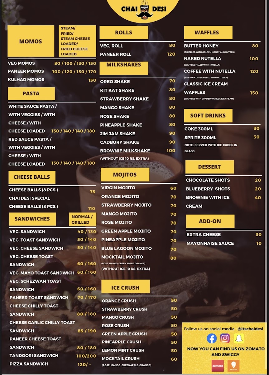 Welcome to Chai Desi, a delightful café located in the vibrant Jesal Park, Bhayandar East. This cozy spot invites you to indulge in a menu that celebrates the rich tradition of tea paired with a wide array of delectable snacks. With prices that cater to everyone, you can savor their famous Cheese Balls starting at just ₹75, or opt for one of their variety-packed Veg Sandwiches ranging from ₹40 to ₹100.
